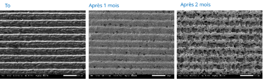 avant et après immersion de 1 et 2 mois en mer (grossissement x200) – ©UBSIDE